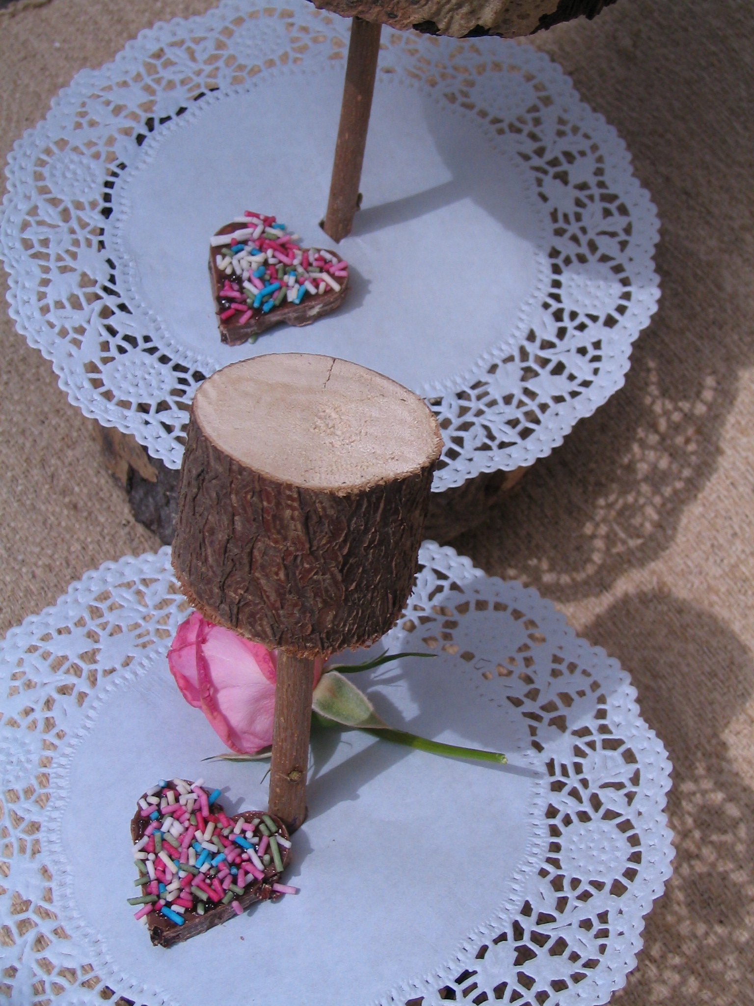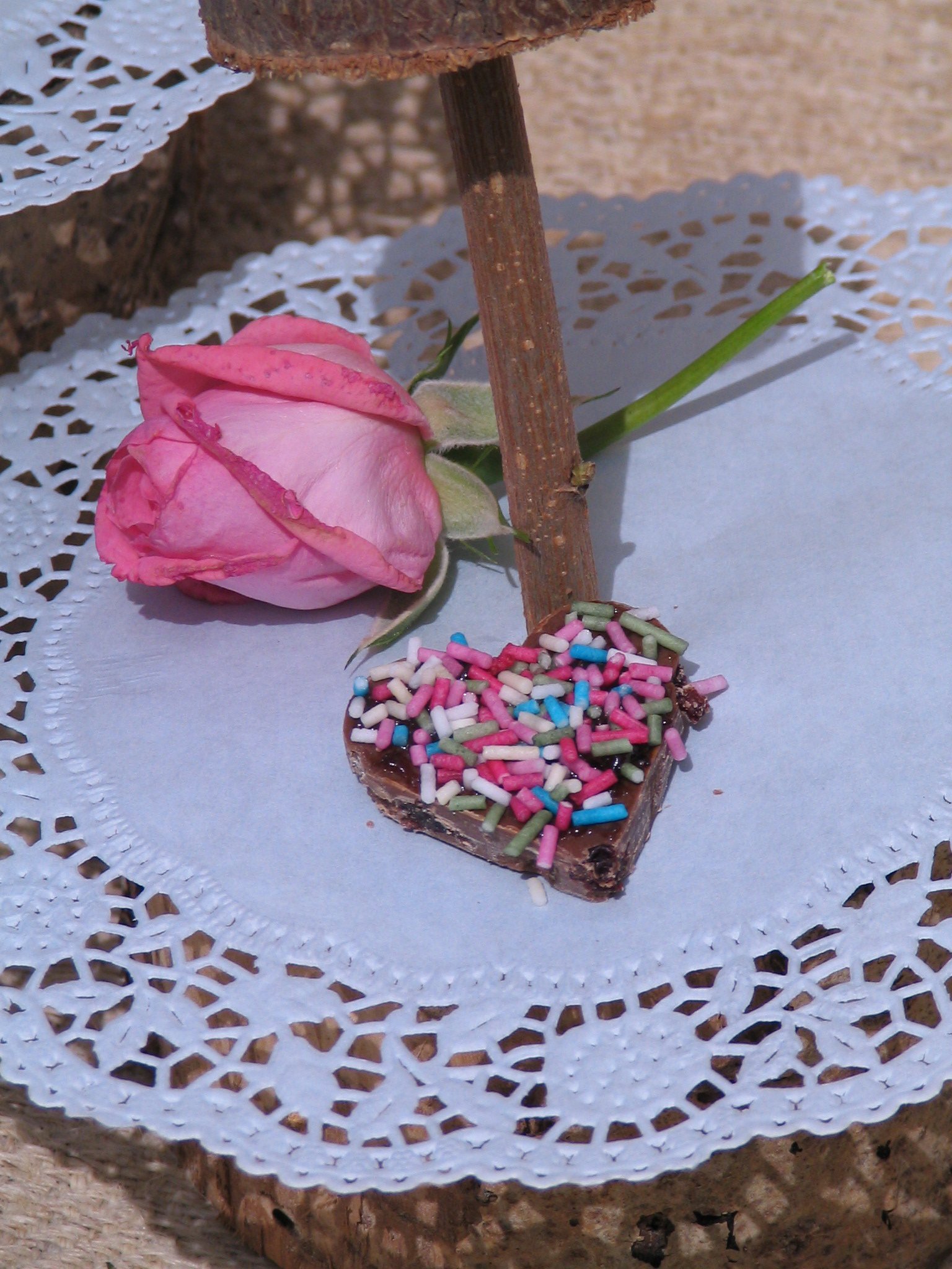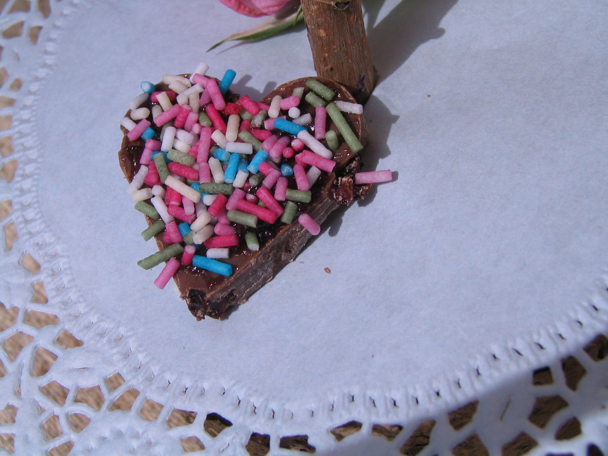 A színes szívecskét gyorsan tábla csokoládéból szív alakú kiszúróval készítettem, a tetejét megkentem szilvalekvárral és megszórtam színes cukorkával- már nem léteznek…:)